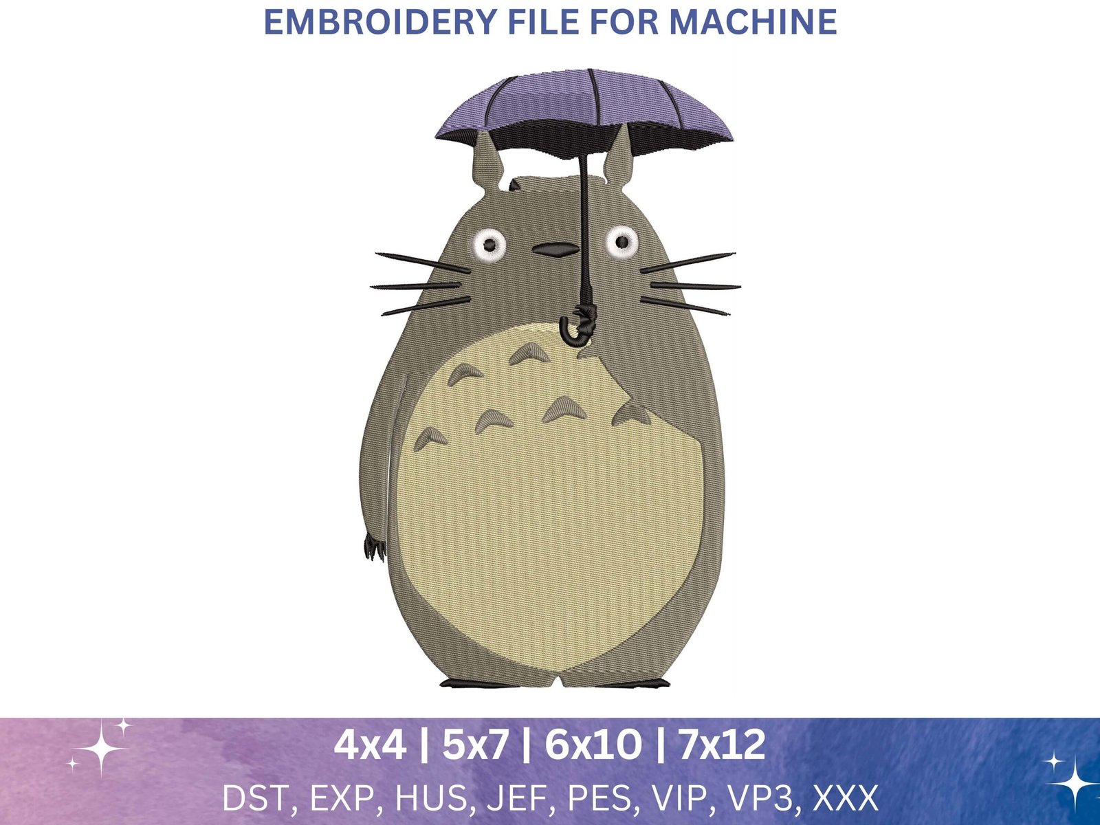 Bring Totoro to life on your embroidery machine with this design. This Totoro embroidery file is tailored specifically for anime machine embroidery enthusiasts.