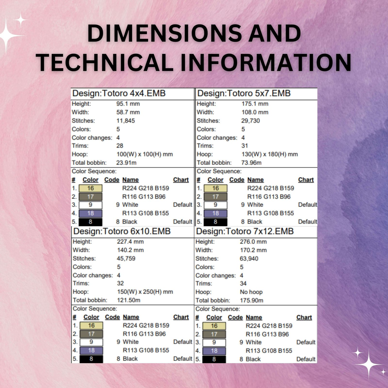 4 sizes: 4x4, 5x7, 6x10 & 7x12 hoop compatibility - not embroidery dimensions (you can find the dimensions in the listing images).